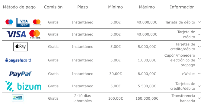 Al monento de depositar, la operación fundamental para comenzar a jugar, la cantidad mínima varía según el método elegido, entre €5 y €100. El máximo también varía entre €1.000 y €150.000. Para todos los casos, excepto la transferencia bancaria, el depósito es instantáneo, y ninguno pide comisiones extra.