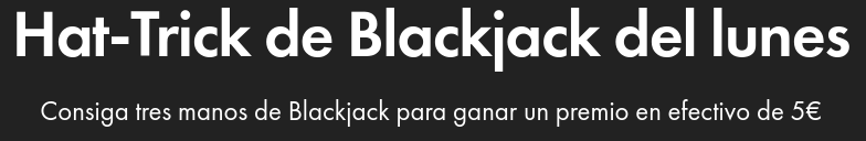 Los jugadores tienen acceso a varias promociones para los juegos de casino. El Hat-Trick de Blackjack del lunes te otorga un premio de €5 en efectivo cada vez que obtenga tres manos de blackjack, con un máximo de 3 premios.
