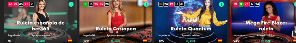 Algunos de los títulos ofrecidos con la Ruleta española de Bet365, Ruleta Casiopea, Ruleta Quantum y Mega Fire Blaze: Ruleta.