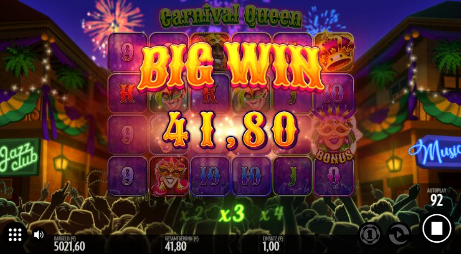 The theoretical RTP (Return to Player) for Carnival Queen is 96.1%. That’s only an average value and considering that this slot is definitely volatile (although not as volatile as other games we’ve played recently), you will have to hold onto your budget.