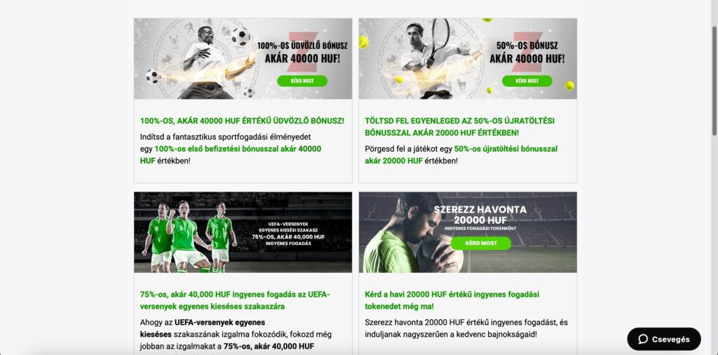 Később pedig 50%-os befizetési bónuszt szerezhetsz, azon túl, hogy 40 000 forint értékű ingyenes fogadási bónusz is várhat rád. Havonta egyszer viszont 20 000 forint ingyenes fogadás is vár, a 10 000 forintos másik promóció mellett.