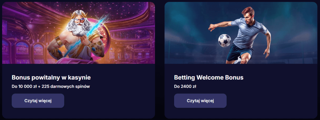 Dla fanów zakładów bukmacherskich przygotowano osobny pakiet, co przekłada się na kompletne doświadczenia dla fanów hazardu. Można otrzymać 100% do 1200 zł i 150% do kolejnych 1200 zł, z obrotem 20x przy minimalnych kursach 1.5–1.75.