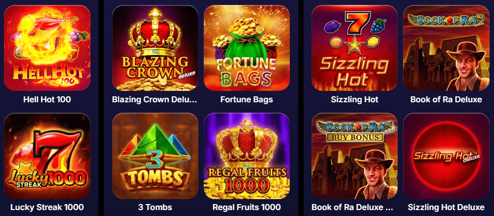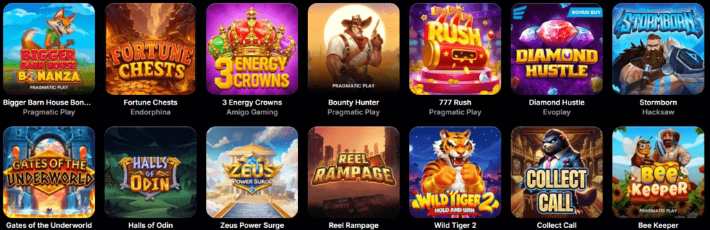 Można tu znaleźć tak znane tytuły jak Gates of Olympus 1000 od Pragmatic Play czy Sizzling Hot Deluxe od Novomatic, a także wiele mniej oczywistych slotów od mniejszych dostawców.
